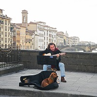 書き忘れていたのですが、10月から本欄の左上のスペースを飾っている写真の舞台はフィレンツェのアルノ川にかかる橋です。有名なベッキオ橋だったかどうかは記憶にありません。ベッキオの場合は橋上にびっしりと店舗が並んでいるので、ひょっとしたらその近くの別の橋だったかもしれません。冬枯れの街の橋の上でギターを弾く男の姿はまさにイタリア的なんですが、この構図の主役はもちろん犬です。 |